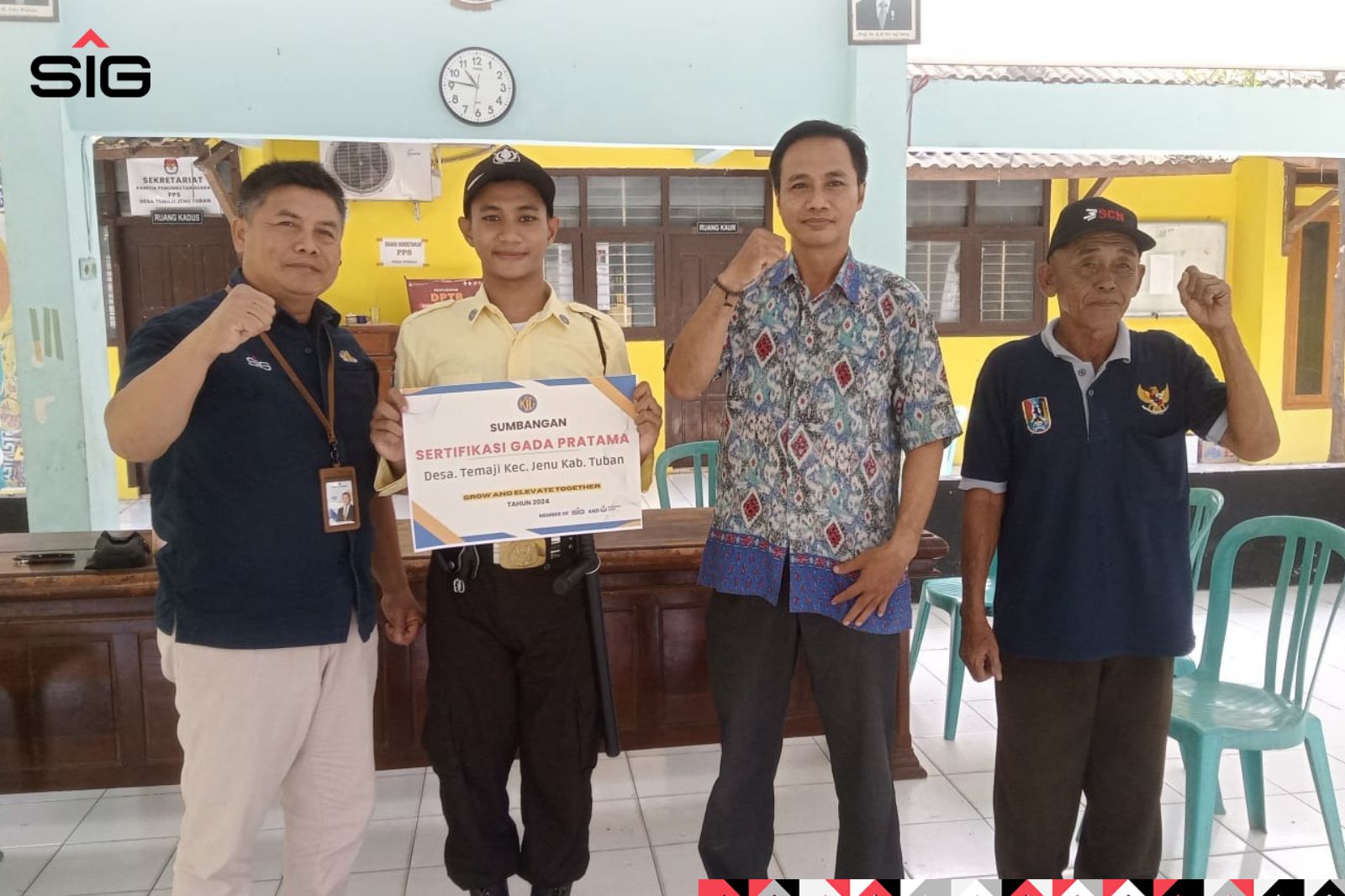 Didampingi orang tua masing-masing, wajah dua pemuda asal Desa Temaji dan Desa Socorejo, Kecamatan Jenu, Kabupaten Tuban, itu tampak berbunga-bunga. Keduanya baru saja lulus diklat Gada Pratama yang merupakan pendidikan dan pelatihan dasar wajib bagi calon satpam. Adalah manajemen KIG yang memfasilitasi dua warga sekitar perusahaan tersebut sehingga bisa mengikuti diklat Gada Pratama.